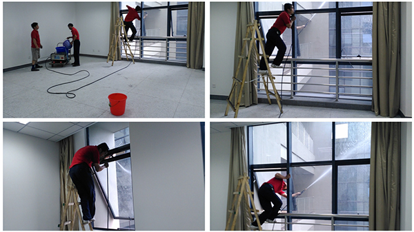 清潔員工先把安全繩系好,然后把留在玻 璃的保護(hù)膜全部撕掉,然后用全能清潔劑對玻璃涂擦后再用玻璃刀把污水刮干凈,有膠的地方用丁酮局部處理。