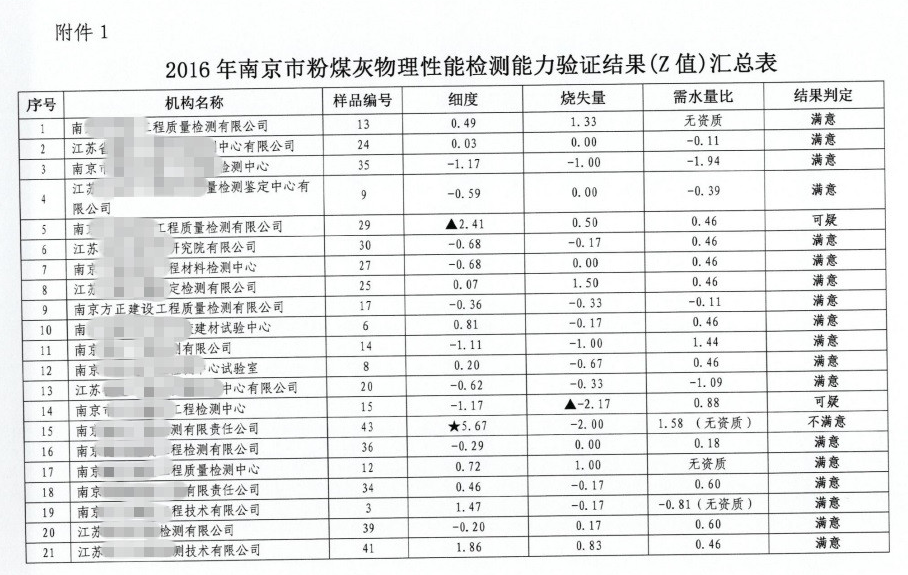 2016年南京市粉煤灰物理性能檢測能力驗(yàn)證情況