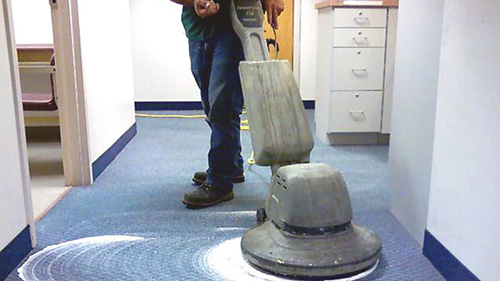 (g)打開發泡開關,待泡沫充滿地毯刷后開動地擦機,將清洗泡沫擦人地毯中。